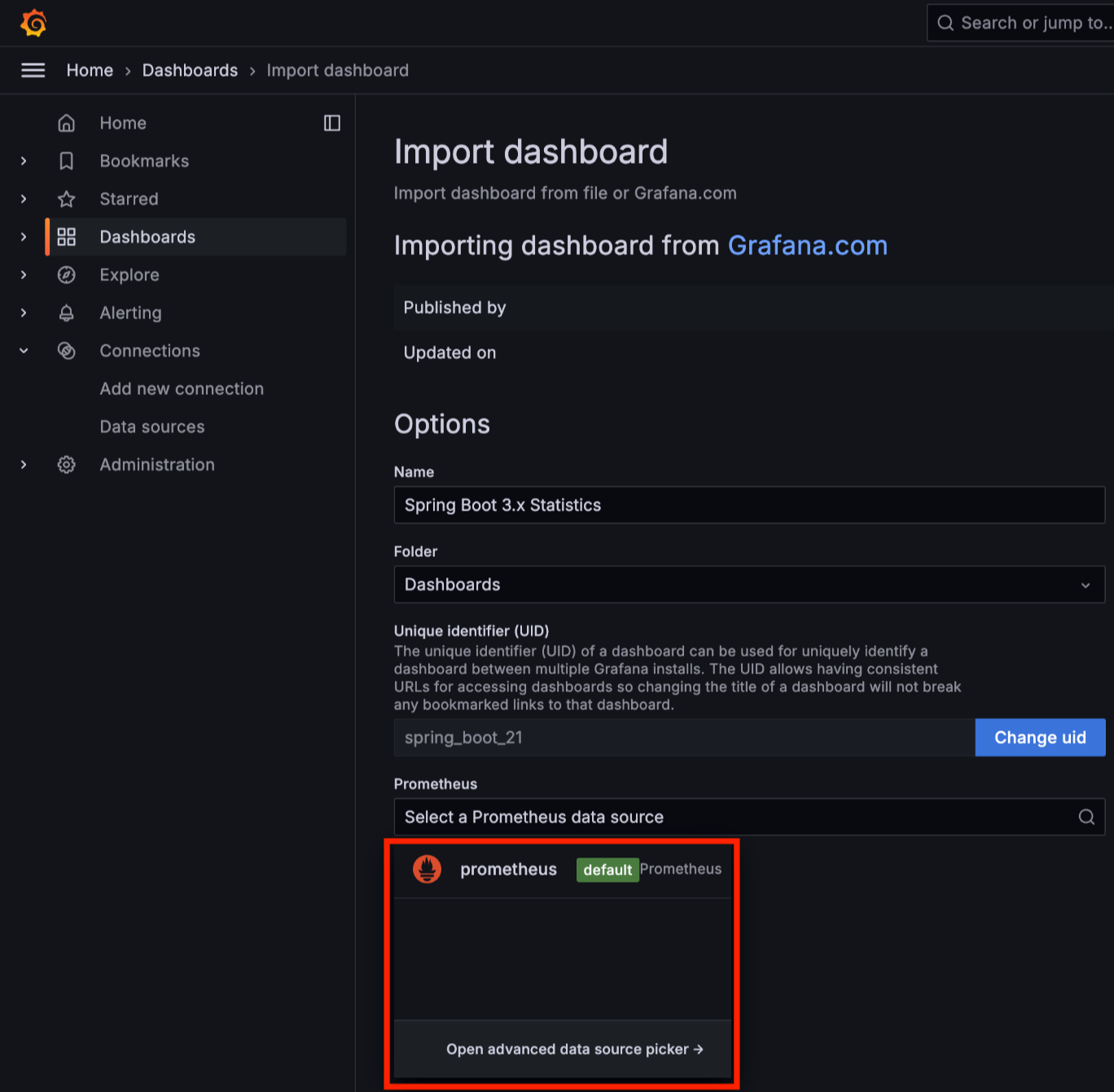 5. Select a Prometheus data source 입력란을 클릭 후, 등록한 Prometheus Data Source를 선택한 뒤 Import를 클릭