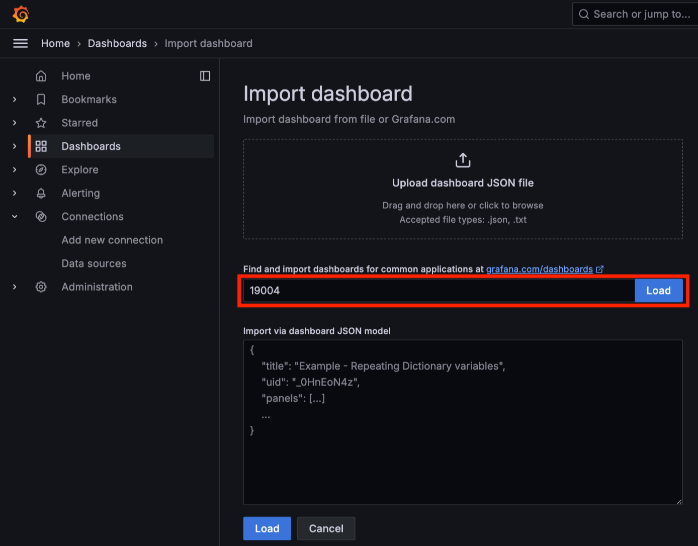 Import the dashboard template Copy ID to clipboard or Download JSON