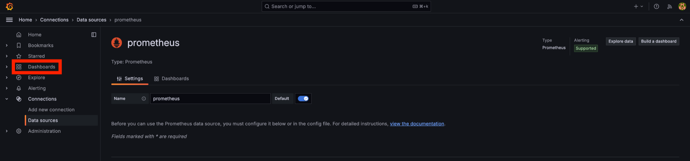 Grafana 대시보드에서 Prometheus를 데이터 소스로 추가한다.