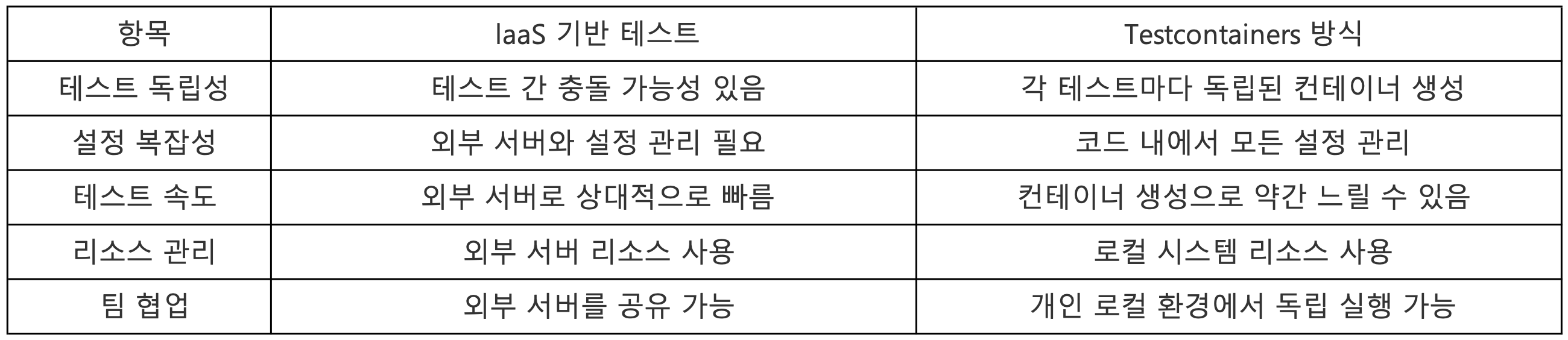이처럼 Testcontainers는 초기 실행에서는 느리지만, Docker의 캐싱 덕분에 이후 테스트 속도는 laaS 기반 방식과 비슷하거나 더 빠르게 느껴질 수 있다.