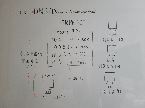 ARPANET 시절에는 hosts.txt 파일 한 장에 모든 호스트 이름과 IP 주소를 수동으로 기록했다.